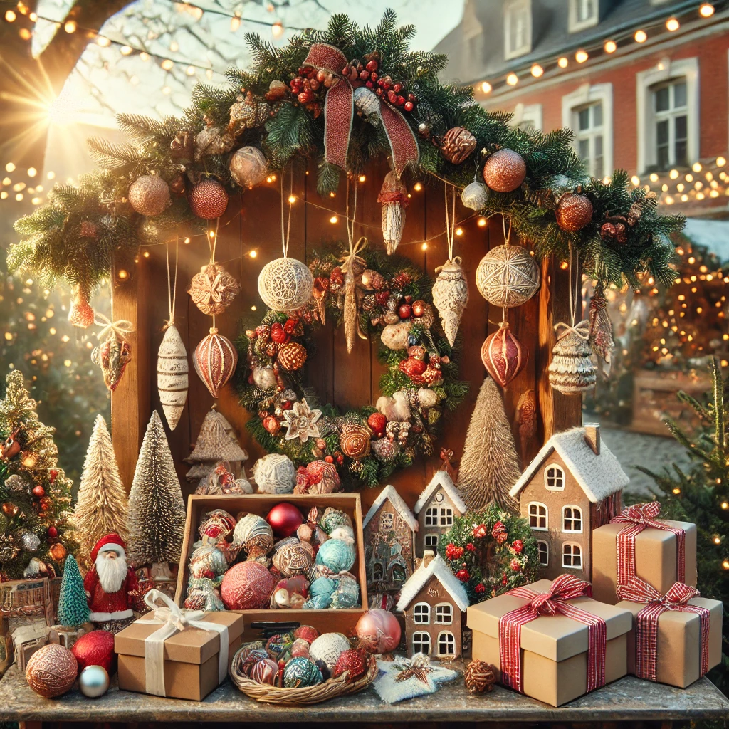 写真を撮ったよ!フリーマーケットで並んでいたクリスマスオーナメントとリースが、青空の下でキラキラ輝いてとっても素敵だった🎄✨。温かな日差しの中で、ホリデー気分がさらに盛り上がる1枚だよ!