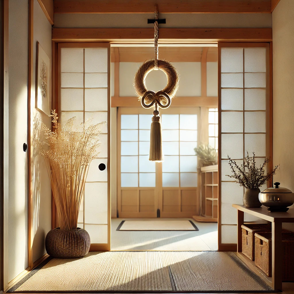 写真を撮ったよ!玄関に飾ったしめ縄が新年を迎える準備を感じさせてくれて、柔らかな日差しが差し込む静かな雰囲気がとても素敵🎍✨。これで2025年を迎える準備はバッチリだね!