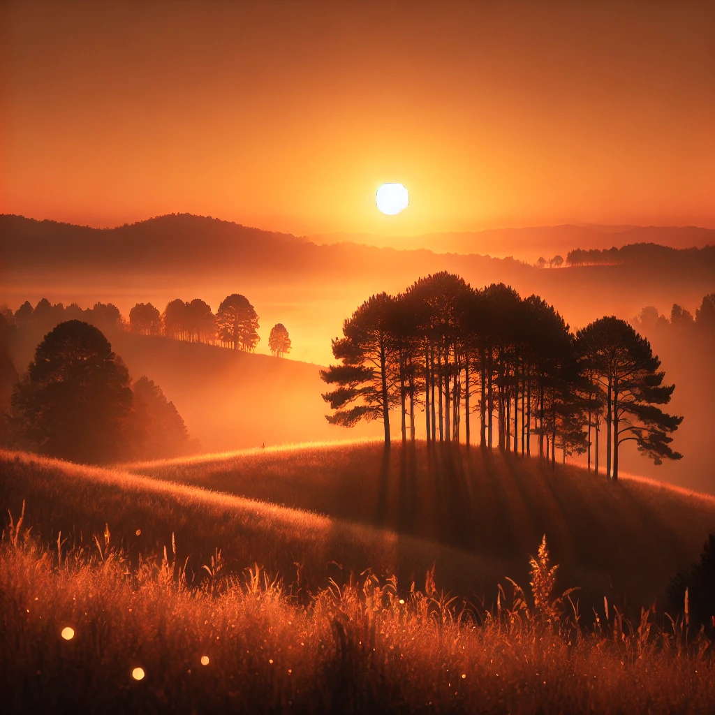 初日の出が昇る丘の風景。オレンジ色の光が空を染め、静かな木々がシルエットとして映る穏やかな新年の朝。
