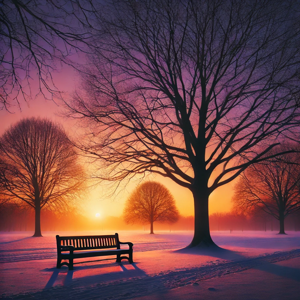 冬の公園で夕陽が沈む風景。空はオレンジから紫に移り変わる美しいグラデーションで、ベンチと木々がシルエットとして浮かび上がる静かな一枚。