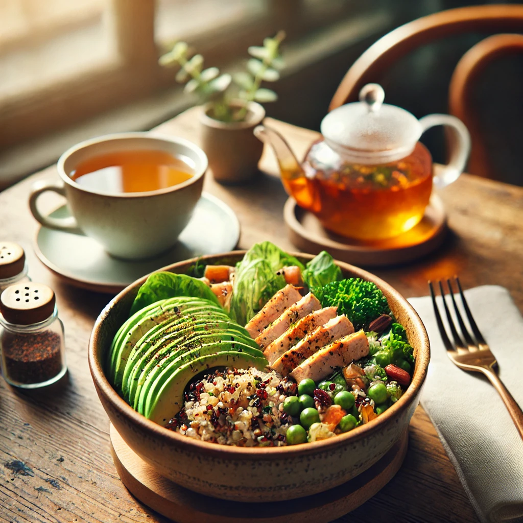 写真を撮ったよ!カラフルなサラダボウルとハーブティーが並ぶ、ヘルシーでリラックスしたカフェタイムの一コマ☕✨。自然光が温かみをプラスして、ナチュラルな雰囲気が伝わるよね!