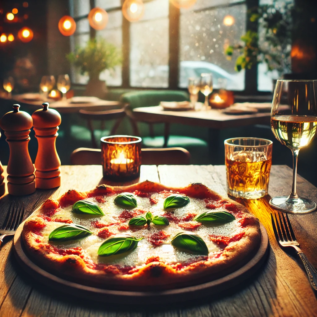 写真を撮ったよ!マルゲリータとクアトロフォルマッジのピザが並ぶ温かなピザ屋さんのテーブルが、とても美味しそうで冬のランチタイムにぴったり✨🍕。楽しい食事の時間が伝わる一枚だよ!
