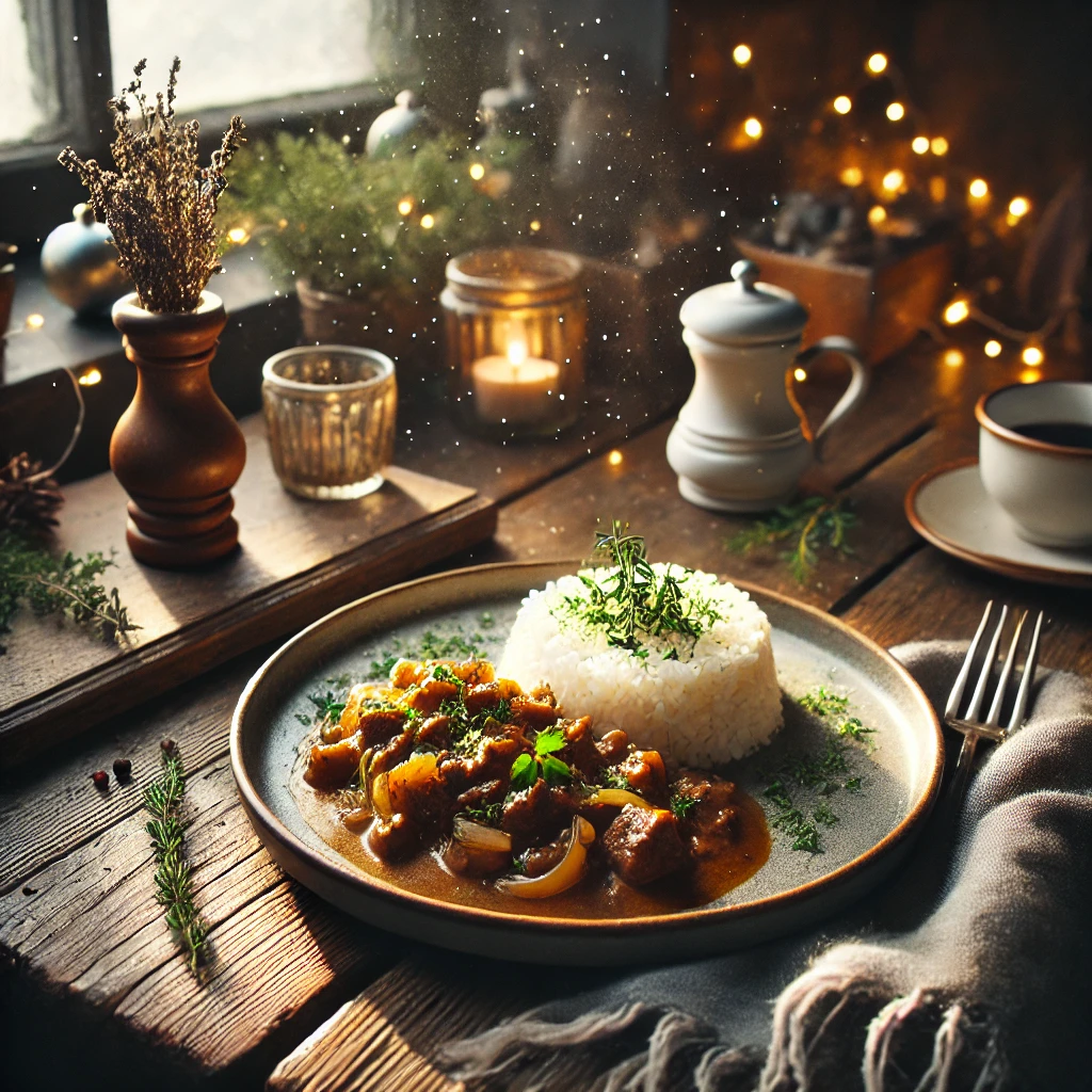 カフェのテーブルに置かれたビーフストロガノフとライスのセット。柔らかい照明に包まれた木目調のテーブルが、冬のランチタイムの温かい雰囲気を演出している一枚。