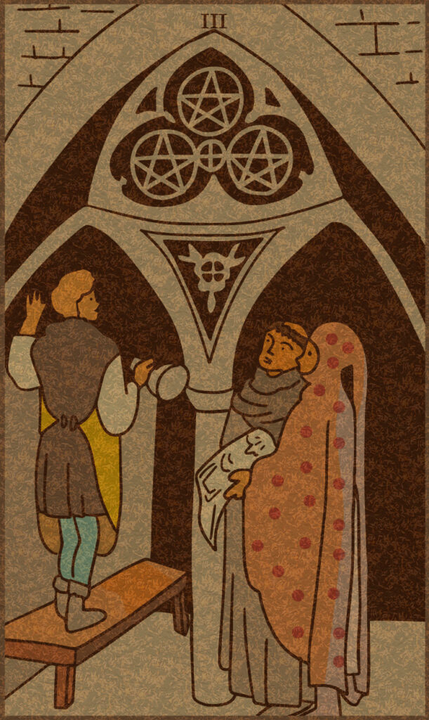 タロットカード: 「女教皇」「ペンタクルの10」「カップの4」