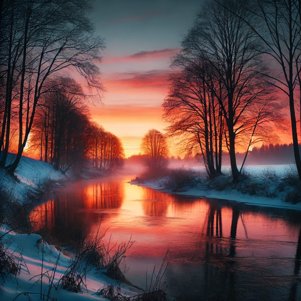 川沿いに広がる夕焼けの風景。水面に映るオレンジ色の空と、静かにたたずむ木々が冬の静けさを感じさせる一枚。