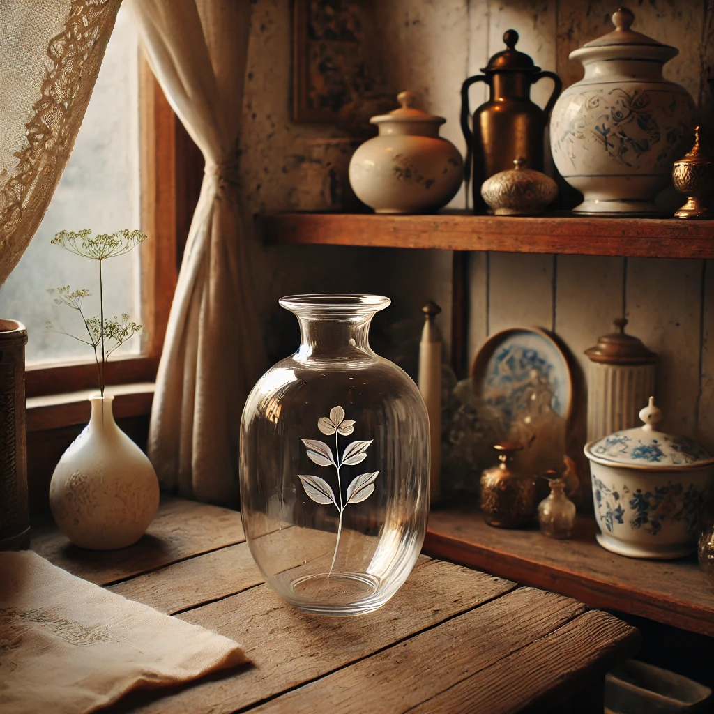 写真を撮ったよ!小さなアンティークショップで見つけたガラスの花瓶が、繊細で上品な雰囲気を醸し出している一枚✨。背景に並ぶ小物たちが温かみを添えて、素敵な空間が広がっているね!