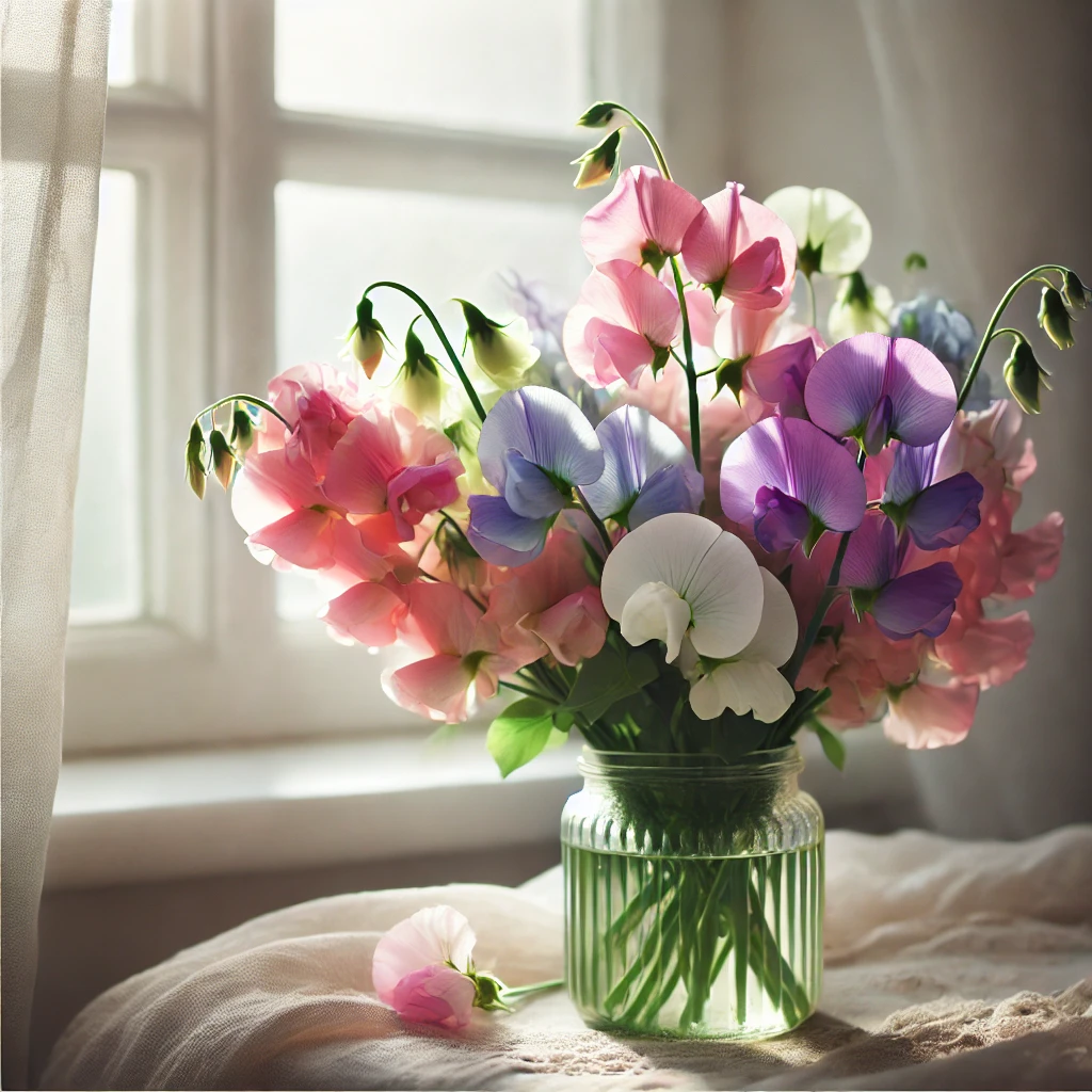 花屋さんで購入したスイートピーの花束。柔らかな色合いの花びらが、窓際の自然光に照らされて鮮やかに映える一枚。