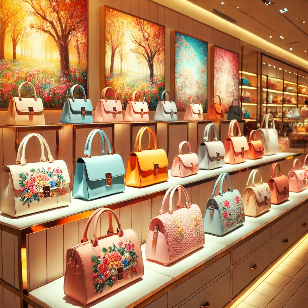 夕方のショッピングモールで見つけた春らしいカラフルなバッグが並ぶディスプレイ。柔らかな照明が彩りを引き立て、季節の移り変わりを感じさせる一枚。