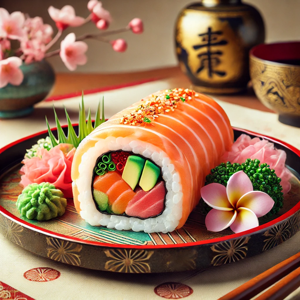 写真を撮ったよ!恵方巻が和の器に美しく盛り付けられていて、彩り豊かな具材が映える一枚✨🍣。節分の特別な雰囲気が伝わるといいな!