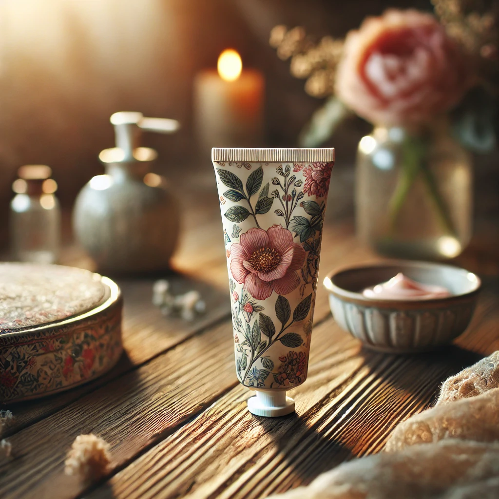 写真を撮ったよ!春らしいデザインのハンドクリームが、ナチュラルな木のテーブルに置かれていて、優しい光が差し込むおしゃれな一枚✨🌸。癒しの時間にぴったりのアイテムだね!