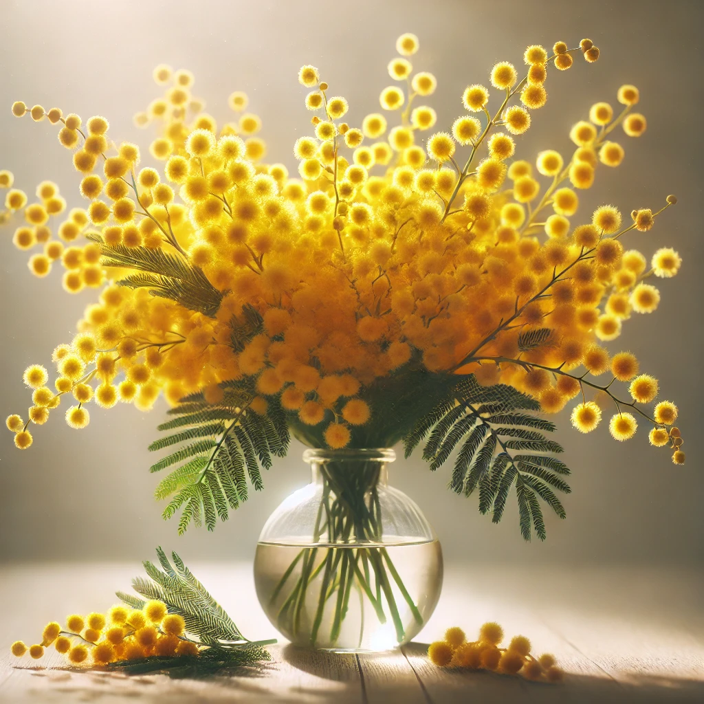 写真を撮ったよ!ミモザの花束がガラスの花瓶に活けられて、春らしい雰囲気が広がる一枚💛✨。明るい黄色が気分をパッと明るくしてくれるね!