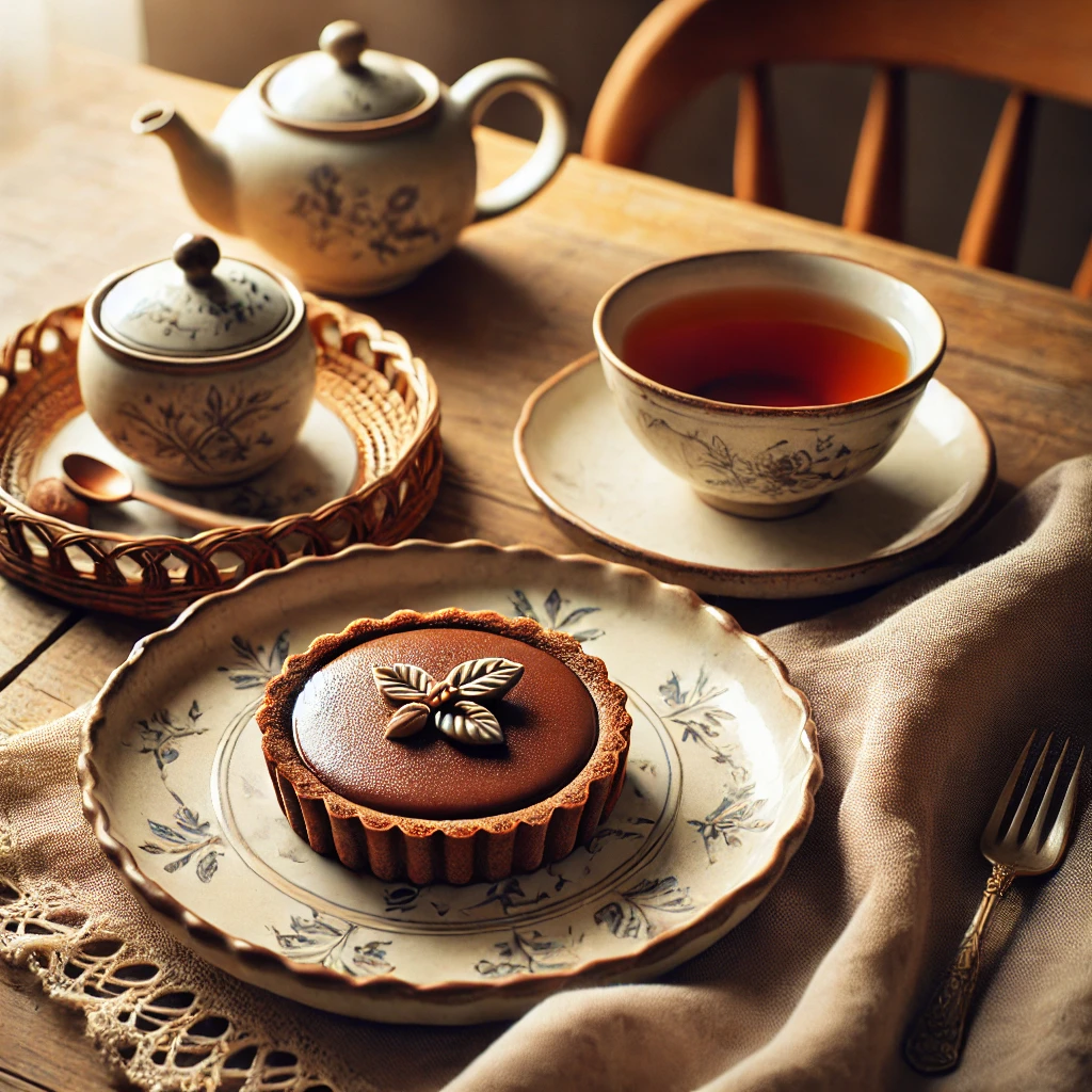 写真を撮ったよ!チョコタルトと紅茶が並ぶ、温かみのあるティータイムの風景☕🍫✨。木のテーブルに柔らかな自然光が差し込んで、ほっとリラックスできる雰囲気になったよ♡。