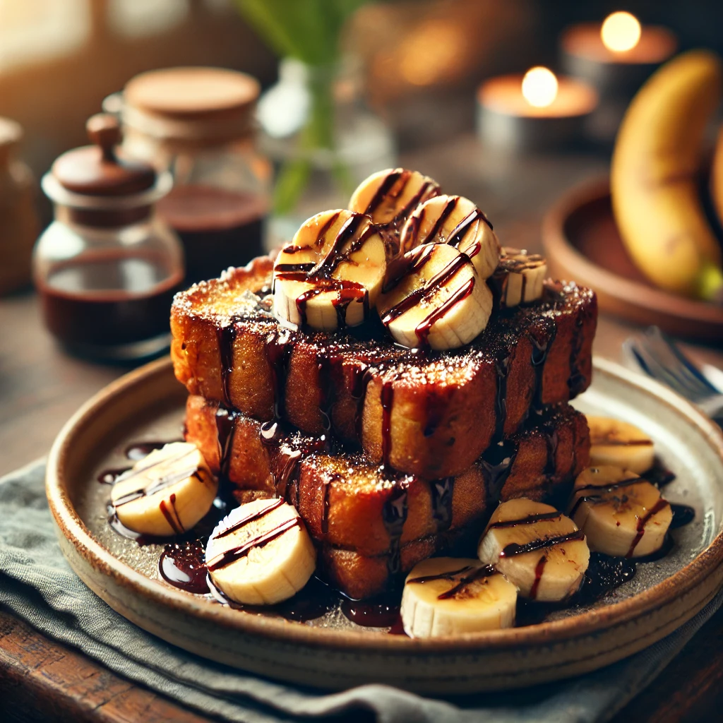 フレンチトースト専門店で食べたチョコバナナフレンチトースト。ふわふわのパンにたっぷりのチョコソースとスライスバナナがのった、贅沢な一皿。