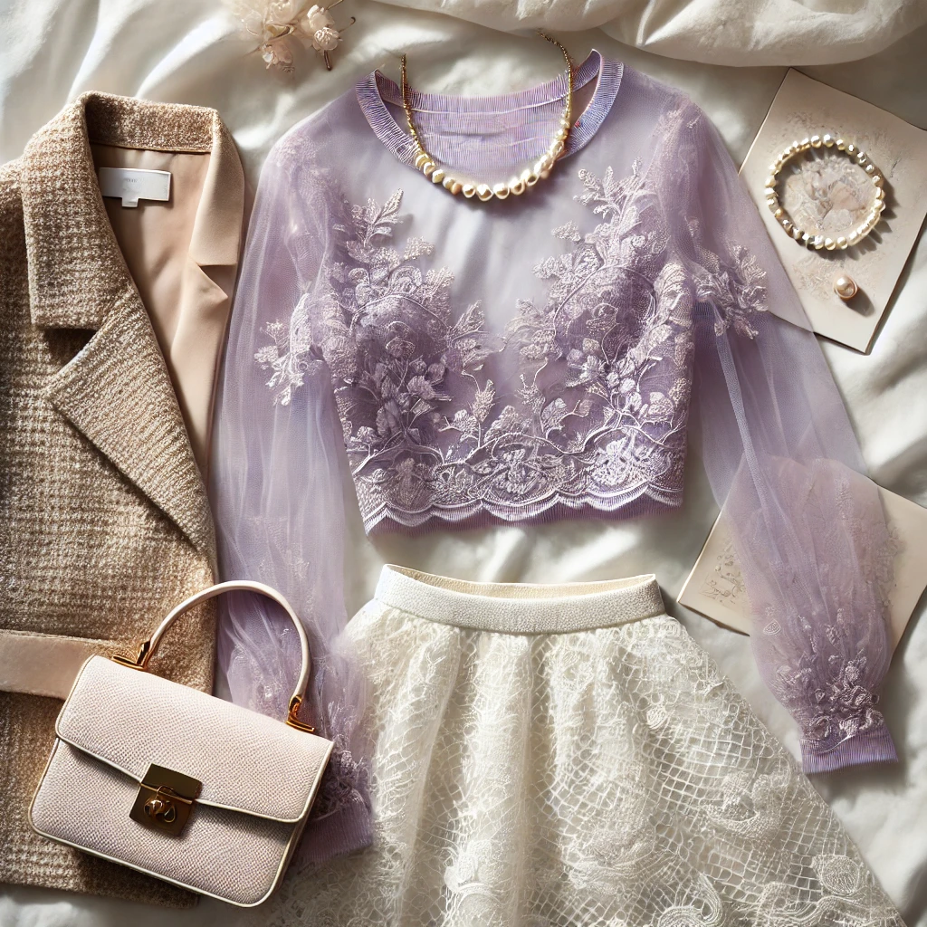 ショッピングでゲットした 「ラベンダーのシアーブラウス&レーススカート」 をパシャリ📸✨ 春っぽくてめちゃくちゃ可愛い💖 これでデートもバッチリ!!!💕