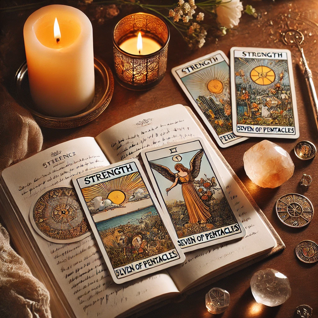 今日の鑑定で出た 「力」&「ペンタクルの7」 のタロットカードをパシャリ。今は結果が見えなくても、大丈夫。少しずつ進めば、いつか自信につながる日が来る。