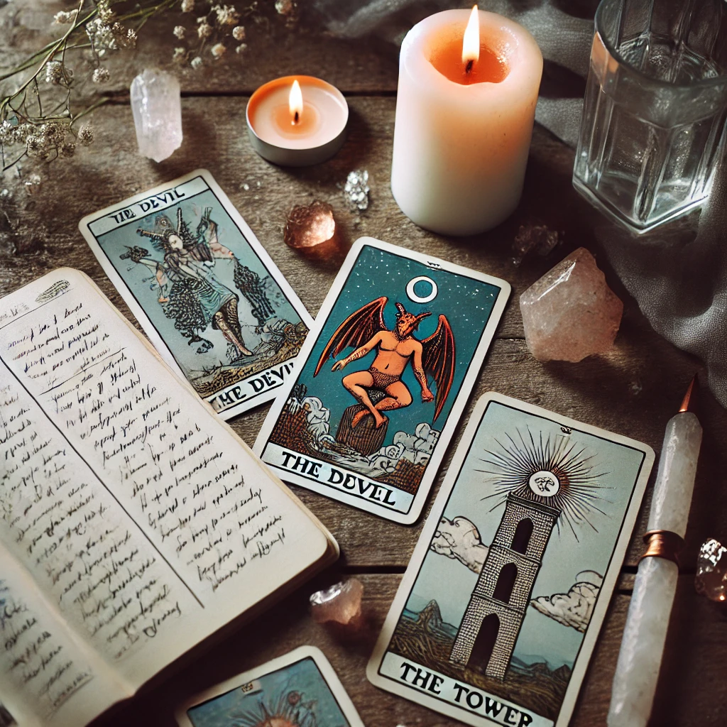 今日の鑑定で出た 「悪魔」&「塔」 のタロットカードをパシャリ。過去に囚われるのは、怖いから。でも、その枠を壊したとき、新しい世界が広がる。