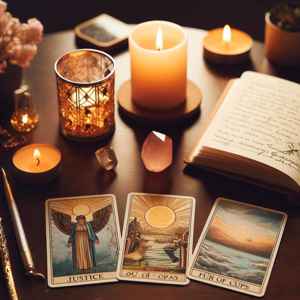 今日の鑑定で出た 「正義」&「カップの4」 のタロットカードをパシャリ📸✨ 今は、心のバランスを取り戻すとき。焦らず、自分の気持ちを見つめ直そう。