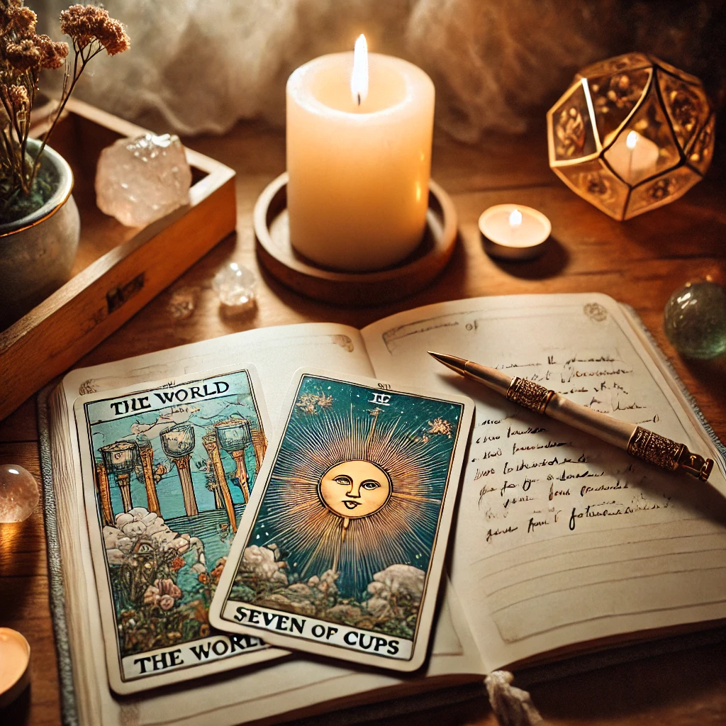 今日の鑑定で出た 「世界」&「カップの7」 のタロットカードをパシャリ📸✨ 理想の未来はすぐそこ。でも、選択の時は自分の気持ちに正直に…。大切なのは、焦らず自分のペースで進むこと。