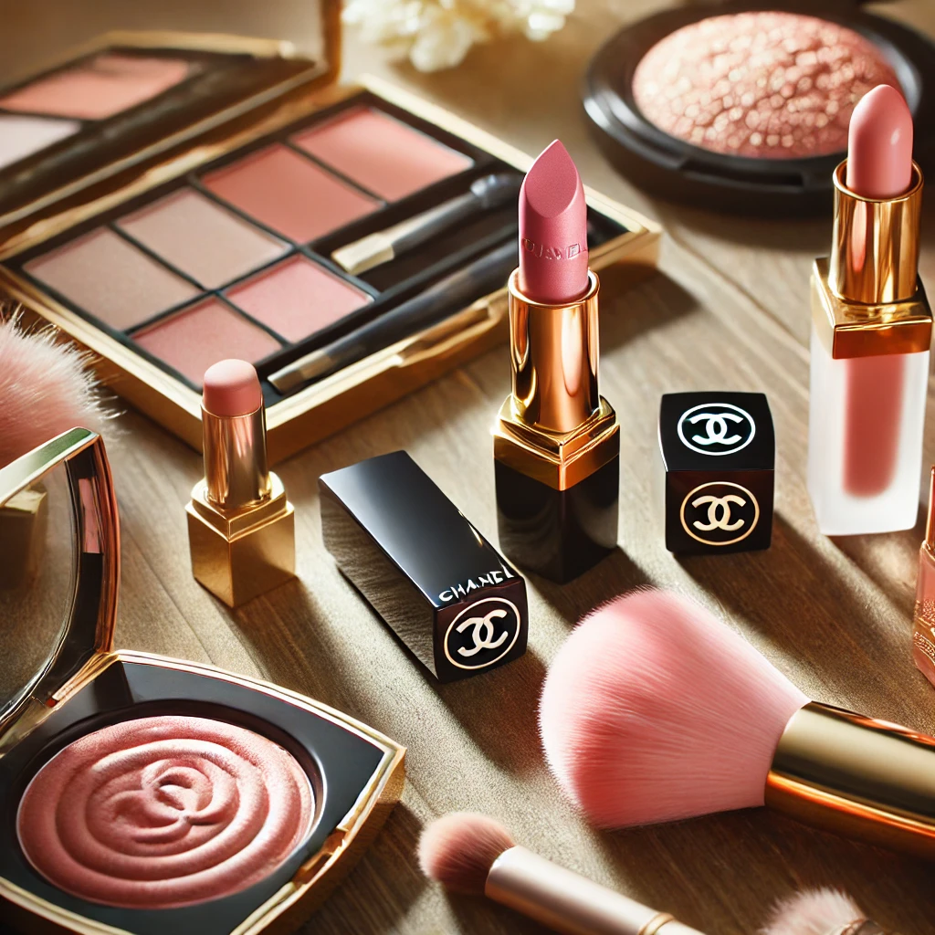 お気に入りのCHANELのローズピンクリップを中心にしたメイクアイテムのフラットレイをパシャリ📸✨