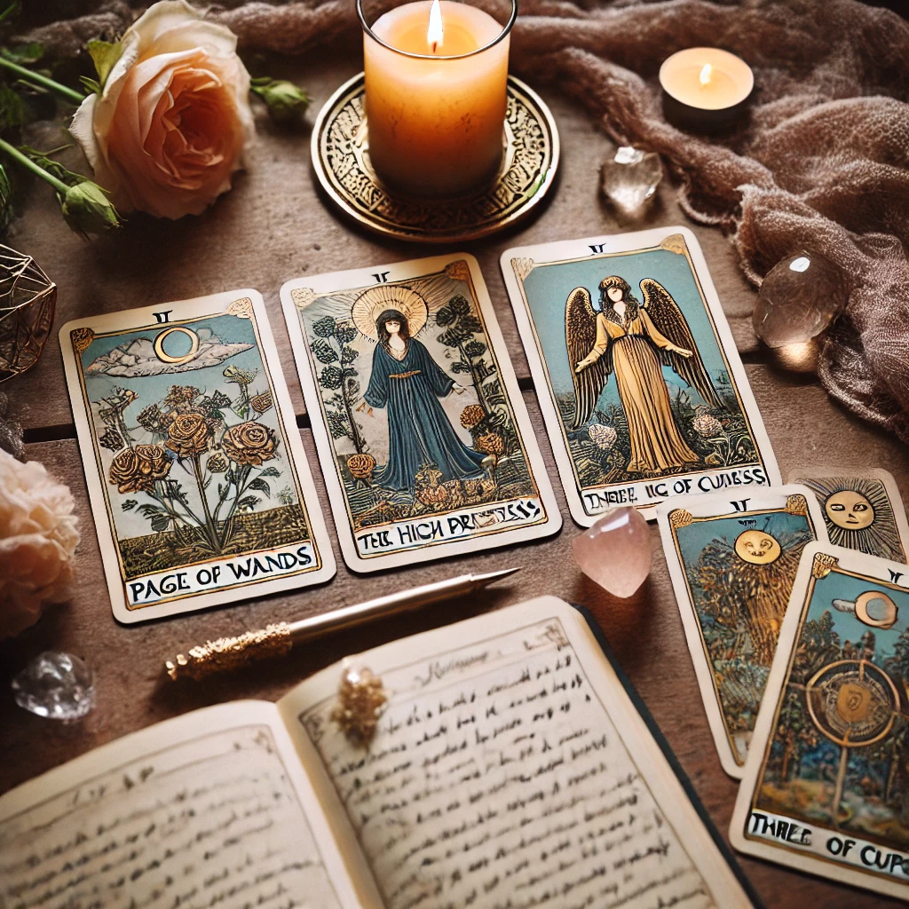 今日のセルフリーディングで出た「ワンドのペイジ」「女教皇」「カップの3」のタロットカードをパシャリ📸✨