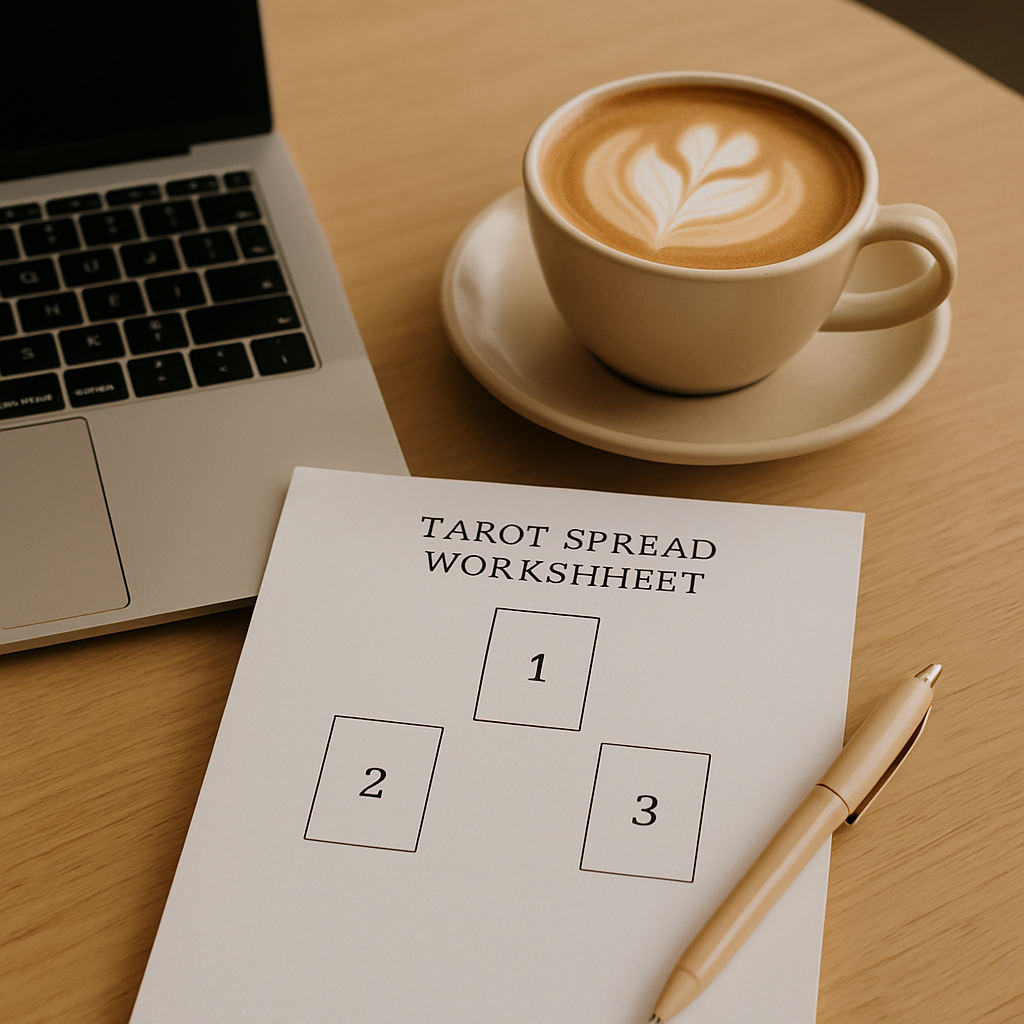 お気に入りのラテとノートPC、それから作成中のタロットスプレッドのワークシートを並べて、”ノマド風おしごとタイム”を切り取ったの♡