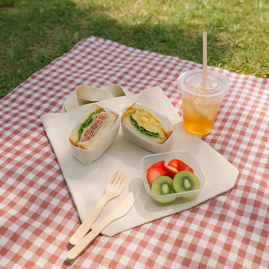 手作りサンドイッチ(たまご&ハムチーズ♡)と、フルーツいっぱいのカップを持って、