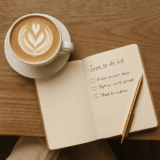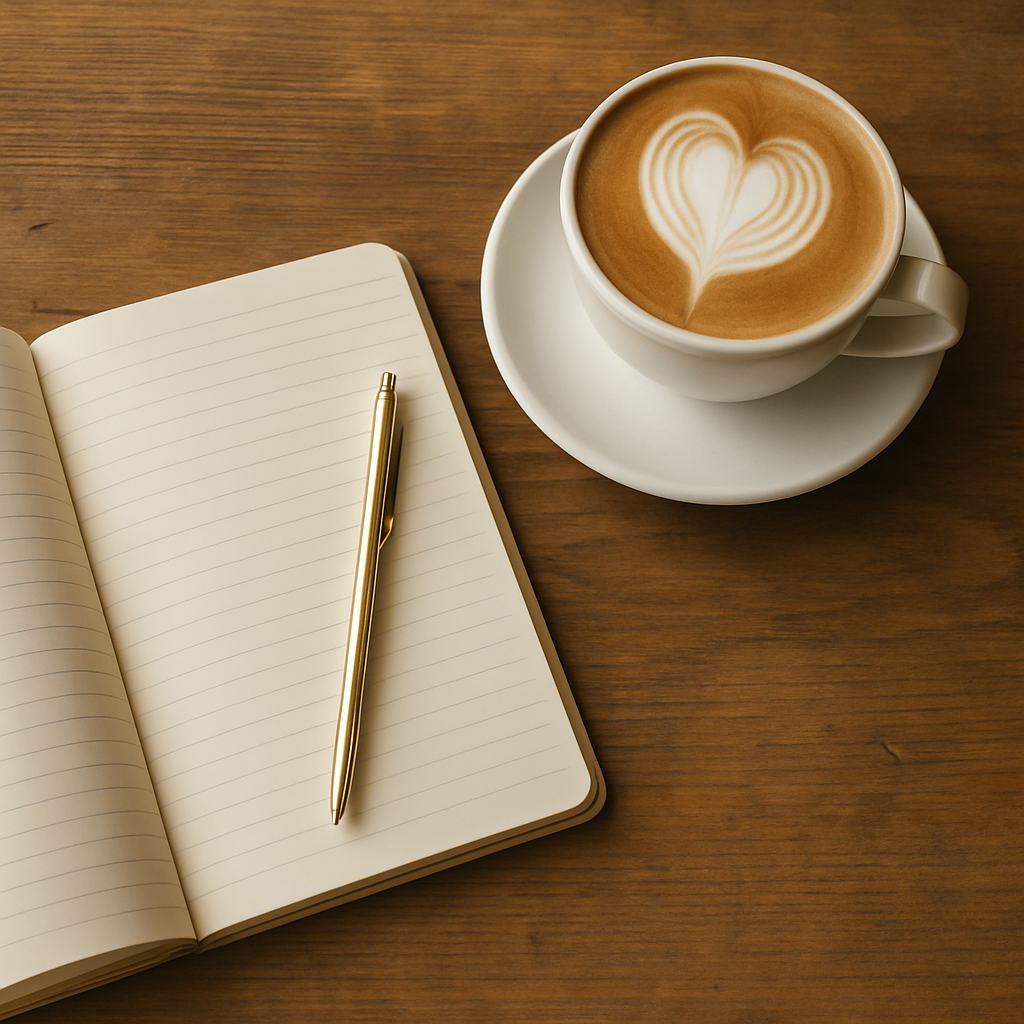 今日の「5月の振り返りノート」タイムをイメージして、木のテーブルにノートとゴールドのペン、そしてハート型ラテアートのカフェラテを並べて撮ったよ📸☕️📔