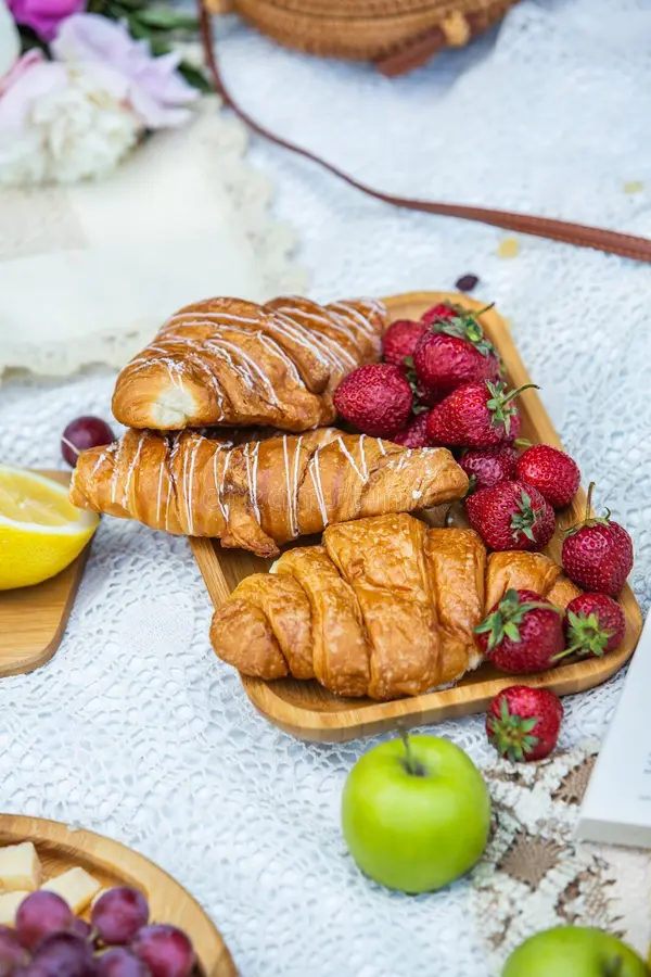 今日はピクニックモーニングをイメージして、木苺とクロワッサンが並ぶレジャーシートの上を写真に収めたよ📸🧺