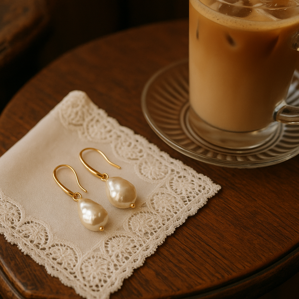 つけたばかりのバロックパールのピアスを、カフェのテーブルでパチリ📸