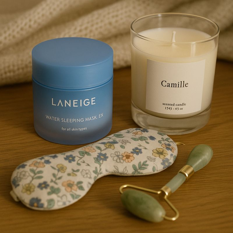 LANEIGEのスリーピングパックと、今日使ったリラックスアイテムを並べて撮ったよ🛁💜