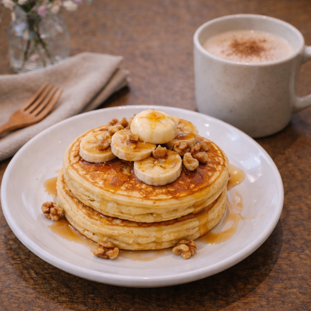 朝ごはんは、あったかいチャイティーとバナナ入りのホットケーキ🥞🍌