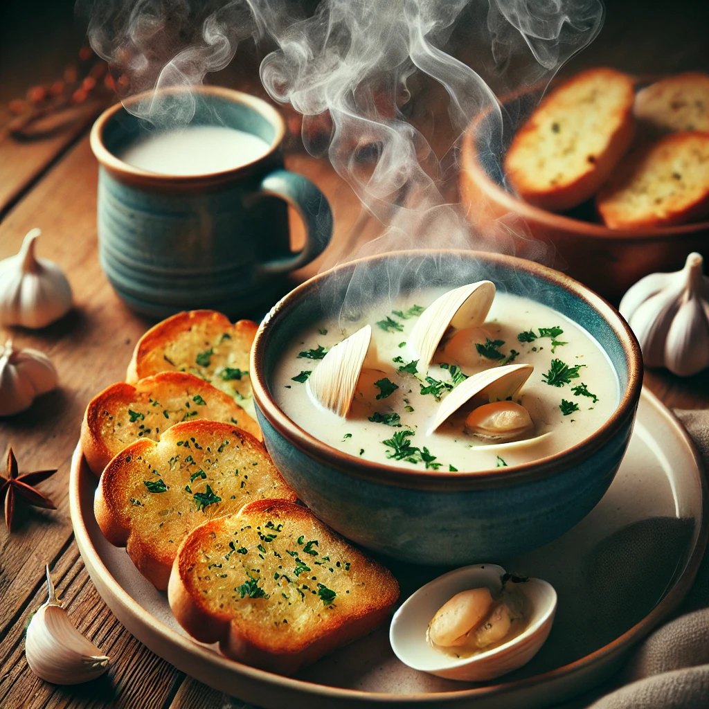 木製のテーブルに置かれたクラムチャウダーとガーリックトーストのランチセット。スープから湯気が立ち上り、冬の暖かさを感じるシンプルで美味しそうな食事シーン。