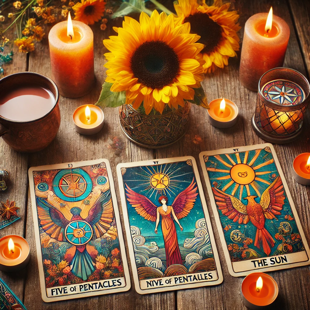 「ペンタクルの5」が示す不足感も、「太陽」のカードが教えるように、ポジティブなエネルギーで解消できます。