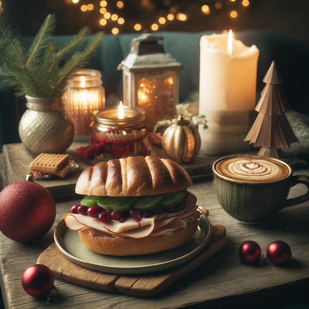 写真を撮ったよ!カフェのクリスマスデコレーションと、ターキーとクランベリーのホットサンドがホリデー気分を盛り上げてくれる雰囲気✨🎄。暖かい灯りが、曇り空の日でも心をほっこりさせてくれるよね☕💖。