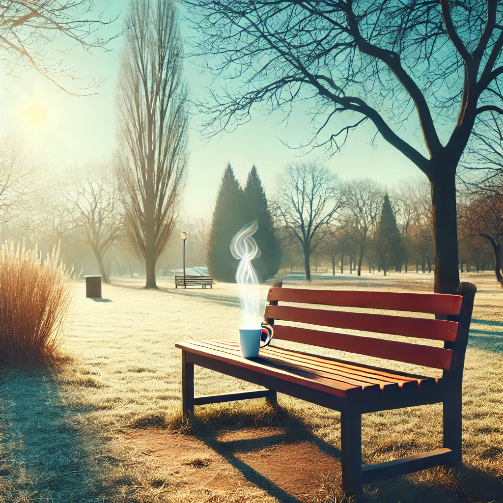 写真を撮ったよ!公園のベンチに置かれたホットコーヒーが、澄んだ青空と冬らしい景色の中でとても穏やかな雰囲気を醸し出してるよ☀️☕。こんな風景を眺めると、心までクリアになる気がするよね!